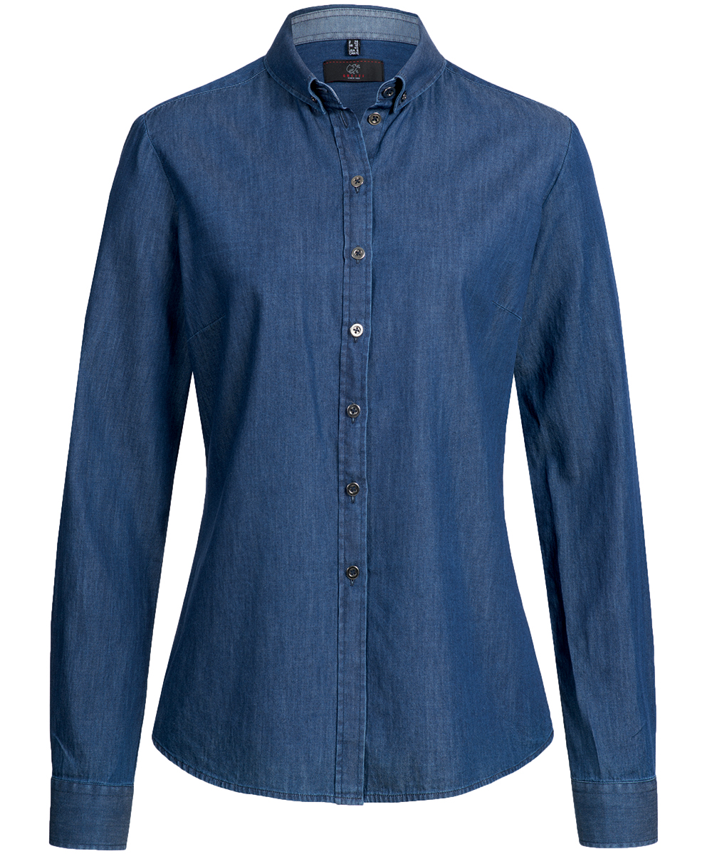 Damen-Bluse Regular Fit, Krempelarm, Button-Down-Kragen, seitlicher Kontrasteinsatz · Gewebe: 100 % Baumwolle, 136 g/m² Grössen: 32- 52
